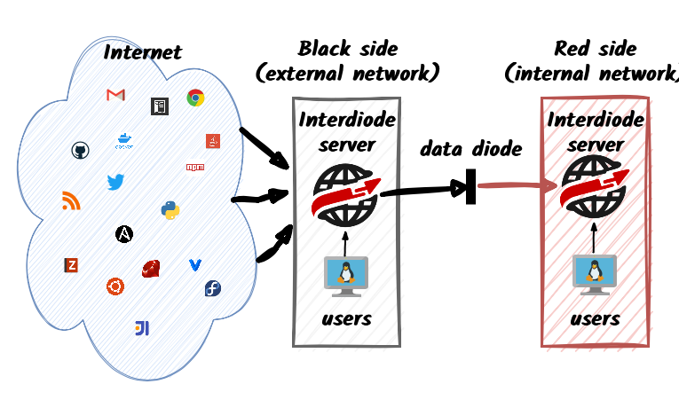InterDiode helps you comfortably work on a disconnected (Air Gap) network. You choose Internet resources to mirror, and they will be made available on your internal network and automatically kept up to date: Linux mirrors, libraries for major programming languages, code repositories, documentation, IDEs, and much more!